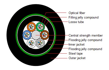 The fibers, are positioned in a loose tube made of a high modulus plastic. The tubes are filled with a water-resistant filling compound. A steel wire, sometimes sheathed with polyethylene (PE) for cable with high fiber count, locates in the center of core as a metallic strength member. Tubes (and fillers) are stranded around the strength member into a compact and circular cable core. The cable core is filled with the filling compound to protect it from water ingress, over which a thin PE inner sheath is applied. After the PSP is longitudinally applied over the inner sheath, the cable is completed with a PE outer sheath.