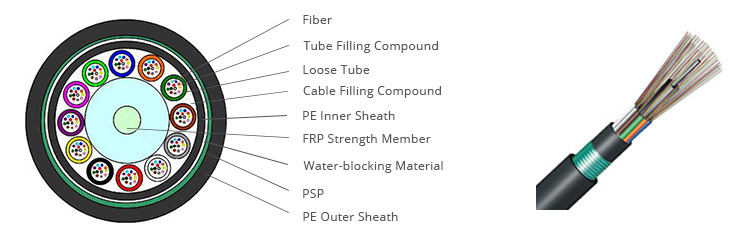 The GYFTY53 fiber cable is constructed by inserting a 250um fibers into a loose tube made of a high-modulus material filled with a water-resistant compound.A Fiber Reinforced Plastic (FRP) locates in the center of core as a non-metallic strength member. The tubes (and fillers) are stranded around the strength member into a compact and circular core. Then the cable core is covered with a thin polyethylene (PE) inner sheath, which is filled with jelly to protect it from water ingress. A layer of water-blocking material is applied around the cable core to prevent water ingress all the same. After a corrugated steel tape armor is applied. the cable is completed with a PE outer sheath.