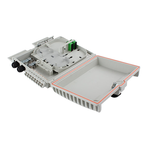 16 port Indoor / Outdoor Wall Mounted Access Termination FTTH Optical Fiber Distribution Box Enclosure has 2 indoor or outdoor cable entrances and 16 ports for drop fiber optic cables. Usually used to assembly with a 1:16 PLC splitter inside with 16pcs fast connectors drop cables.