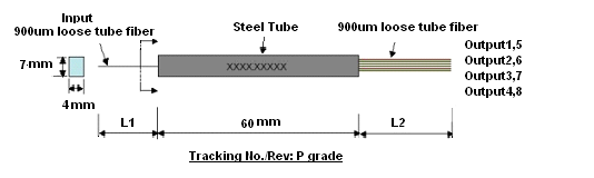 1X8 PLC Fiber Optic Splitter With Steel Tube, G657A Fiber,0.9mm StructureCharacteristics: