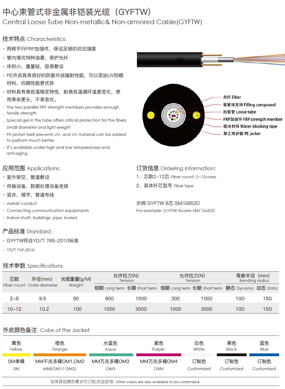 4 Core GYFTW Non-Metallic Strength member FRP Central Loose Non-Armored Fiber Optic Cable Non-metal Central Loose Tube Outdoor Cable can be used in outdoor distribution, trunk power transmission system, and more importantly, it is suitable for access network and local network in high electromagnetic interfering places. The loose tube filled with grease provides special protection for the fiber. The filling compound has the water resistant performance. The two parallel FRP strength member has an excellent anti-electromagnet ability and improve the tensile strength. The cable is completed with the LSZH (LSZH, Low smoke, Zero halogen) material jacket, which has good flame retardant performance.