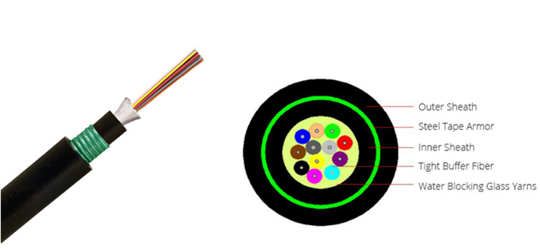MOQ: 1km-2km, or other customizedTight buffered distribution waterproof indoor/outdoor cable contains 4, 6, 8, 12, or 24, 900um tight buffered optical fibers with longitudinally applied glass yarn strength members. It features a double LSZH jackets with the outer jacket being of UV stabilised, water and moisture resistant. Between the 2 sheaths there is a corrugated steel tape making the cable rodent proof. The cable is suited for LAN backbones, direct burial, ducts, under floor or ceiling spaces.Product Specification