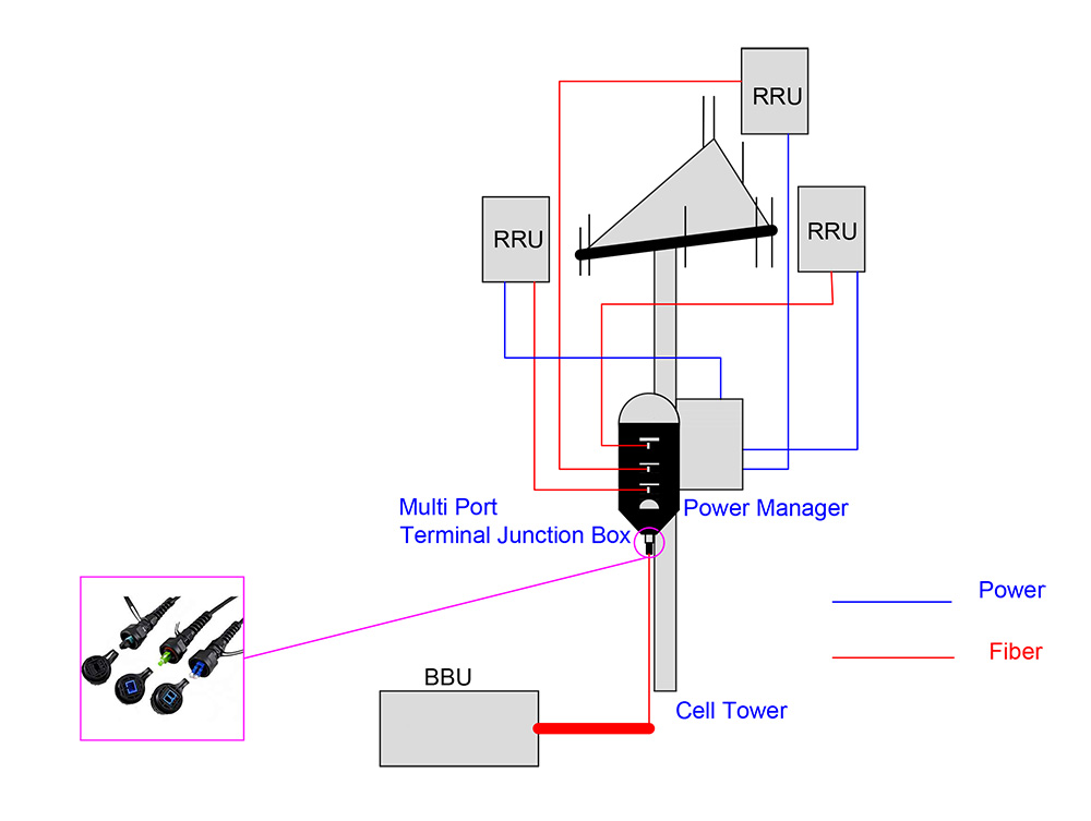 In a FTTA configuration, a baseband unit (BBU) situated near the bottom of the tower is connected via a fiber optic feeder and runs to a remote radio head (RRH) positioned near the antennas at the top of the tower. The RRH converts the digital signals to analog, and the short span between RRH and antenna is still completed using traditional coax cabling.