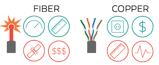 Fiber is great for faster speeds, security and data delivery over super-long distances. But on the flipside, it’s brittle, a bit unwieldy, and much more expensive.