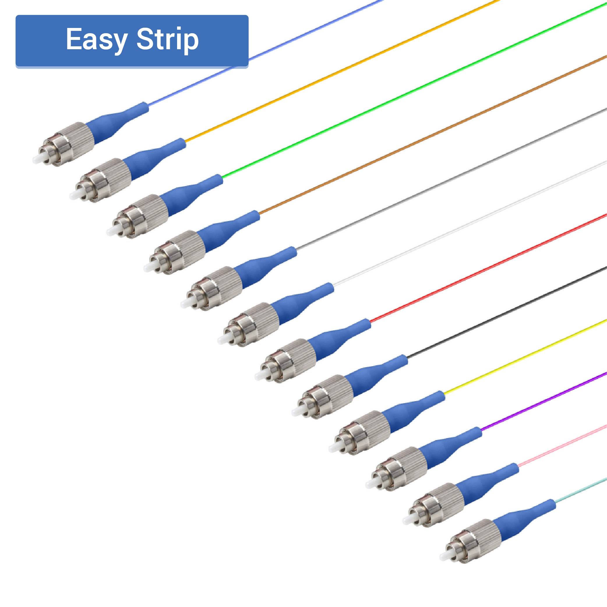 0.9 mm diameter pigtail cables are manufactured with easy-to-strip tubes and ITU-T G657.A2 bend sensitive fibers, then assembled at one end with FC type connector. TIA / EIA-598 color standard is used for 12-color pigtail sets.