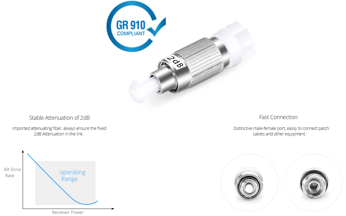 high quality build-out attenuators ranging from 1 to 30dB. Each attenuator is made with continuous light-absorbing and metal-ion doped fiber which offers excellent environmental stability and low back reflection. The front of the attenuator is a male plug connector style that allows the attenuators to be plugged directly into receiver equipment or adaptors in patch panel. The rear is a female socket adaptor that allows a patch cord to be mated into the back of the attenuator. The attenuator is available in SC, FC, ST, LC, and MU type. In a fiber optic system, build out attenuators play an important role in controlling optical power levels in Telecommunications, CATV applications and other single mode fiber optic communications applications. As such, they must offer consistent performance over a range of operating conditions so attenuation levels remain constant and predictable.