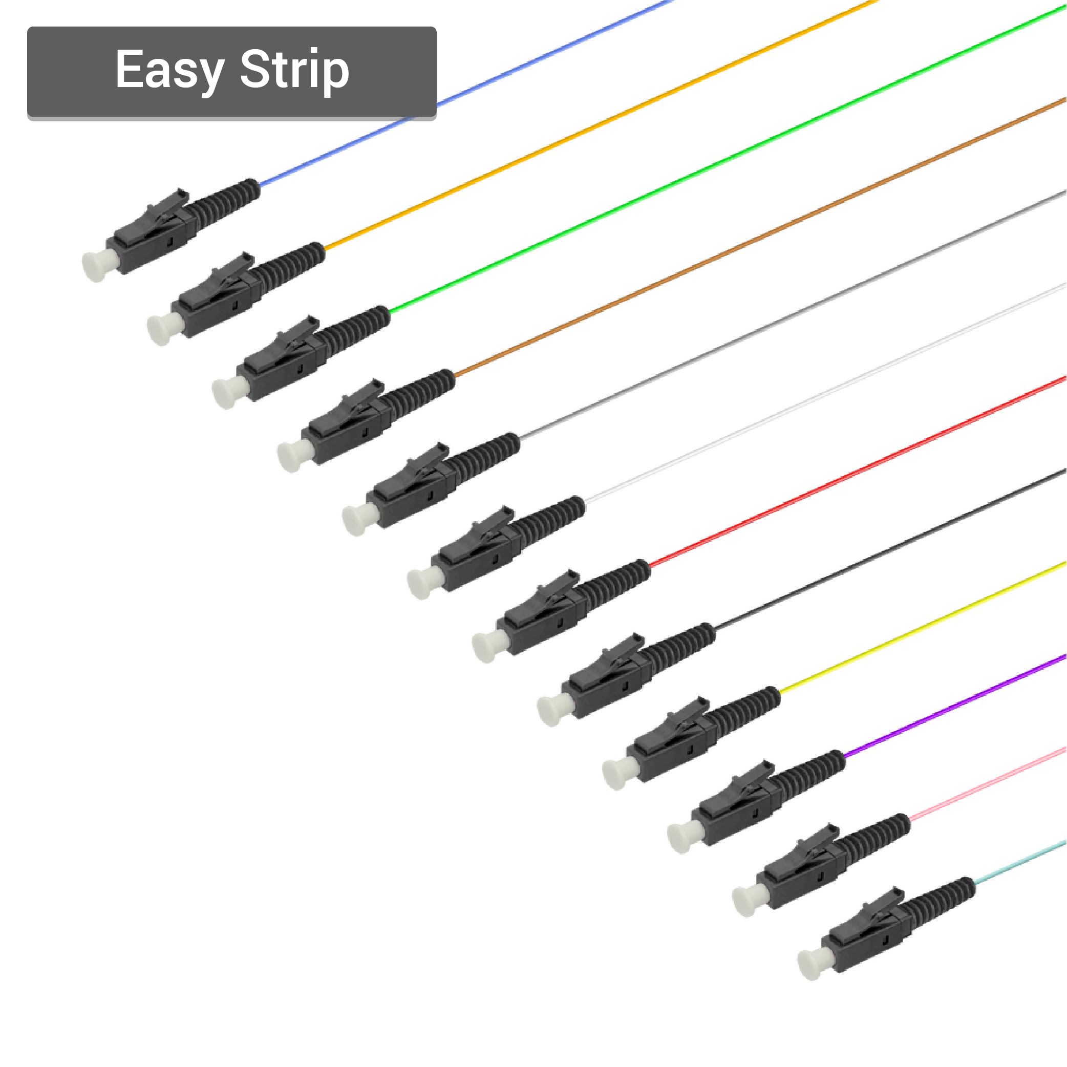 0.9 mm diameter pigtail cables are manufactured with easy-to-strip tubes and ITU-T G651.OM4 bend sensitive fibers, then assembled at one end with LC type connector. TIA / EIA-598 color standard is used for 12-color pigtail sets.