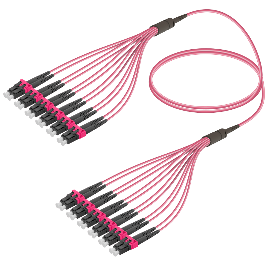 LC/UPC-LC/UPC|12 Fibers Fanout|Multi Mode G651.OM4|3.0/1.8mm Fiber optic fan-outs are designed for patch panels or cable ducts where space-saving is required. For cables that run from patch panels to equipment or patch panels to patch panels,the fan-out cords with either ribbon cables or distribution cables can save space for cable ducts.Distribution cables are more rugged than ribbon cables.