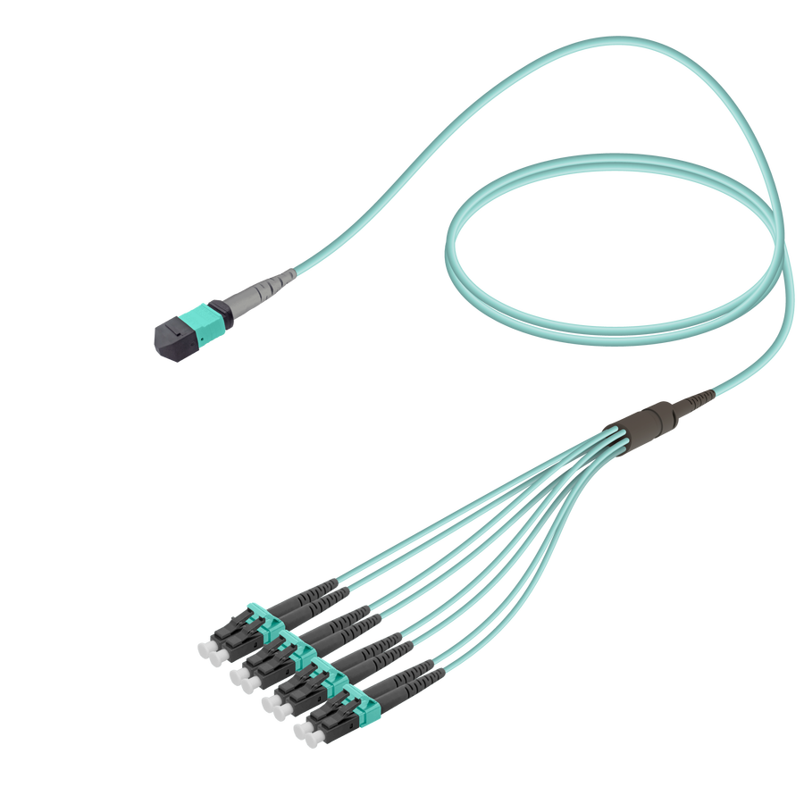 This MTP to LC fanout assembly has one Male Base-8 MTP connector on one side and 4 LC/UPC Duplex connectors on the other, and they are connected by eight 1.8mm Multi-mode OM3 fiber cords that have 8 fibers with 50um core diameter and 125um cladding diameter, and they are bonded within a 3.0mm main cord.