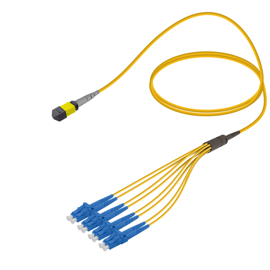 This MTP to LC fanout assembly has one Male Base-8 MTP connector on one side and 4 LC/UPC Duplex connectors on the other, and they are connected by eight 1.8mm single-mode A2 fiber cords that have 8 fibers with 9um core diameter and 125um cladding diameter, and they are bonded within a 3.0mm main cord.