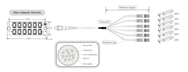 Harness Cable MPO Male To 12 LC Duplex 24 Fibers OM3 Fiber MTP cables are your best choice for high density fiber networks. It’s specifically designed for fast ethernet, fiber channel, data center and gigabit ethernet applications. This 24 Fiber harness cable is used for connecting (12) SFP+ into a MTP adapter panel and MTP trunk. This OFNR cable is designed and tested to conform to IEC-60332-1 and IEC-61034..