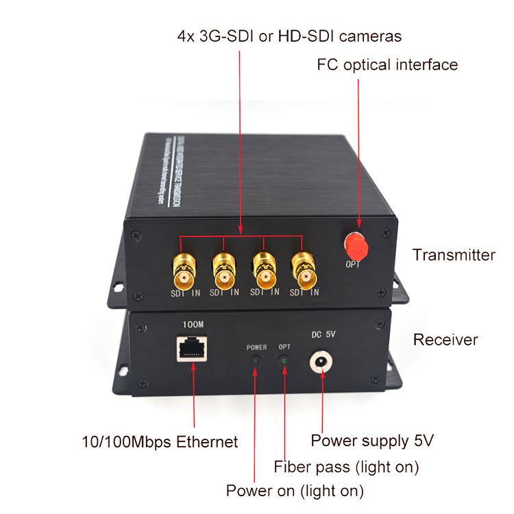 The item is 4 channels of 3G-SDI over a singlemode fiber transmitter and receiver extender kit. This unit provides optical transmission of four 3G-SDI or HD-SDI signal with embedded audio signal and 1 channel 10/100Mbps on the transmitter & receiver for monitoring, The system support signals accord with standards of Support 1080i 59.94 and embedded audio. and support SMPTE424M、SMPTE292、SMPTE295M、SMPTE297M、SMPTE305M、SMPTE310M AND DVB-ASI(EN50083-9)and support digital TV signals such as DVB-ASI meeting the industrial requirements of audio and video equipment with high performance and reliability.