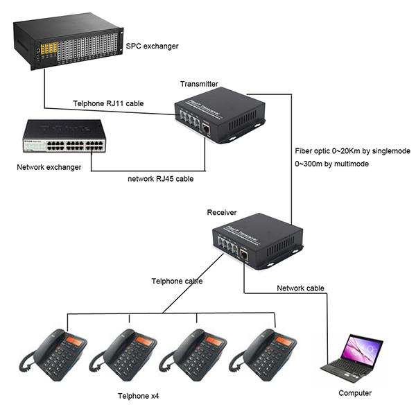 4 PCM Voice Telephone Media Converter Over Fiber with Ethernet The PCM Voice Telephone system over one Fiber Optic S/M up to 20Km (12.4miles) and M/M up to 500m. with one 10/100Mbps Ethernet for network extending, also can use for IP camera with RJ45 connector,SC fiber interface(FC/ST/LC optional). , S/M 40Km/60Km/80Km optional.