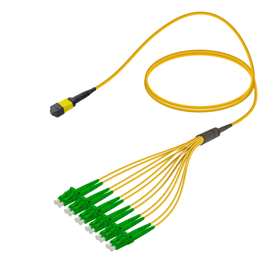 This MTP to LC fanout assembly has one Female Base-12 MTP connector on one side and 6 LC/APC Duplex connectors on the other, and they are connected by twelve 1.8mm single-mode A2 fiber cords that have 12 fibers with 9um core diameter and 125um cladding diameter, and they are bonded within a 3.0mm main cord.
