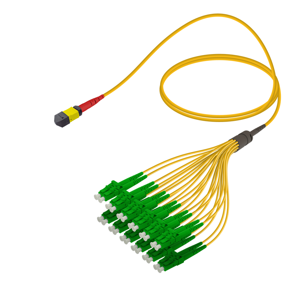 This MTP to LC fanout assembly has one Female Base-24 MTP connector on one side and 12 LC/APC Duplex connectors on the other, and they are connected by 24 single-mode 1.8mm A2 fiber cords that have 24 fibers with 9um core diameter and 125um cladding diameter, and they are bonded within a 3.0mm main cord.