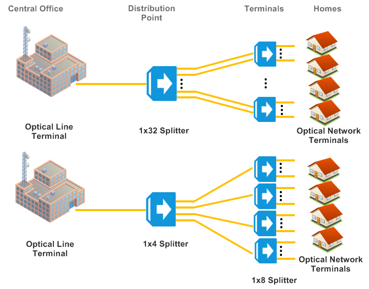 PLC splitter is widely installed between the PON Optical Line Terminal (OLT) and the Optical Network Terminals/Units (ONTs/ONUs) that the OLT serves. The single fiber link coming from the Central Office (CO) OLT is connected with the input of a splitter and is split into given numbers of fibers leaving the splitter. The number of the outputs in the PLC module determines the number of splits. PLC splitters can be used in centralized PON architecture or distributed architecture. In a centralized PON architecture, generally a 1×32 PLC splitter is used in the Central Office. In a distributed PON architecture, a 1×4 PLC splitter is firstly directly connected to an OLT port in the Central Office, then each of the four fibers is routed to an outside plant terminal/enclosure box that houses a 1×8/1×4 PLC splitter. The illustration is as follows: