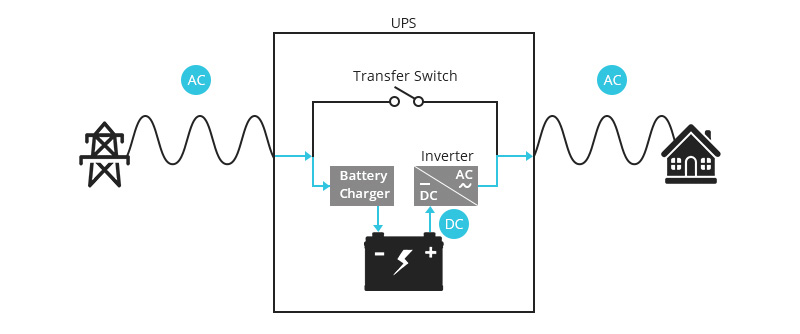UPS refers to uninterrupted power supply. A UPS is a hardware device that provides backup power source when there is a power failure of the primary power source or a significant power drop. A UPS system contains a number of components. For a basic UPS system, it contains batteries, a battery charger, an inverter and a transfer switch. In this basic UPS system, the inverter is used as the device to convert the DC to AC since the power from battery use DC current but it has to be distributed in the form of AC.