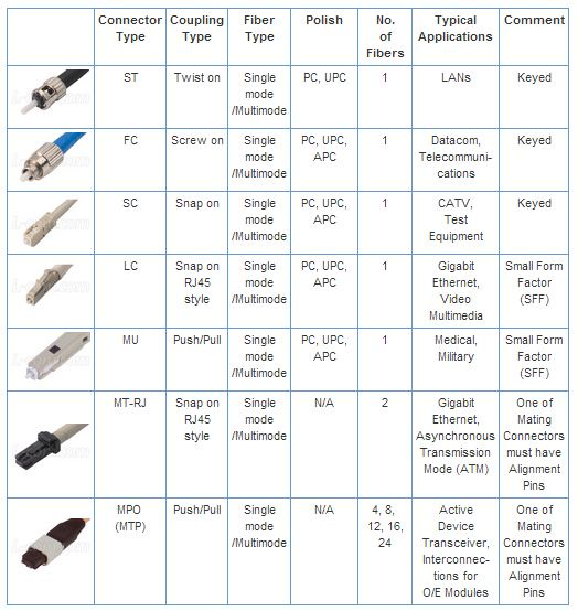 FC, SC, ST, LC, MTRJ, MPO, MU, SMA, FDDI, E2000, DIN4, and D4. Cables are classified by the connectors on either end of the cable; some of the most common cable configurations include FC-FC, FC-SC, FC-LC, FC-ST, SC-SC, and SC-ST