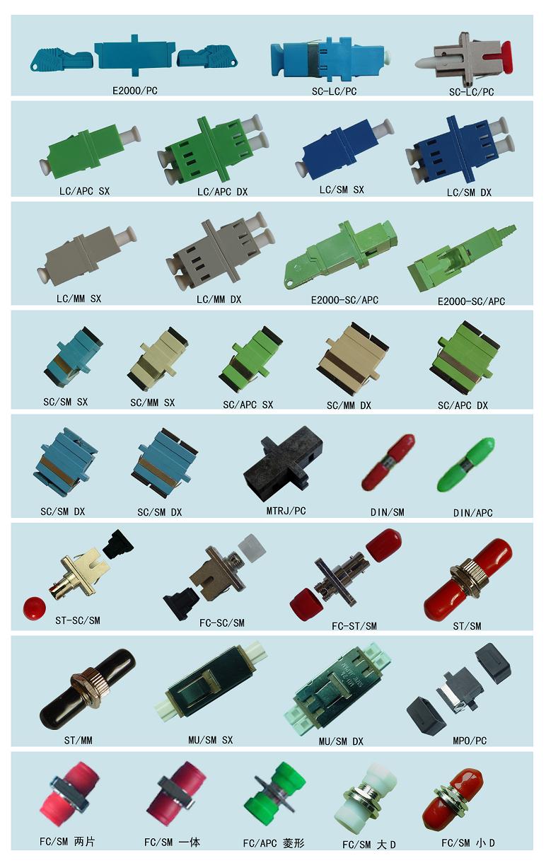 Fiber optic adapters (also called couplers) are designed to connect two fiber optic cables together. They come in versions to connect single fibers together (simplex), two fibers together (duplex), or sometimes four fibers together (quad).