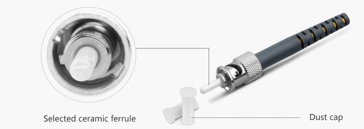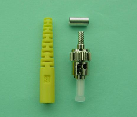 ST fiber connector is with twist-lock bayonet coupling, its 2.5mm keyed ferrule meet the durability and repeatability requirement for the fiber optic links. Typical ST fiber optic connector use metal housing, but plastic housed ST connectors are also used sometimes.